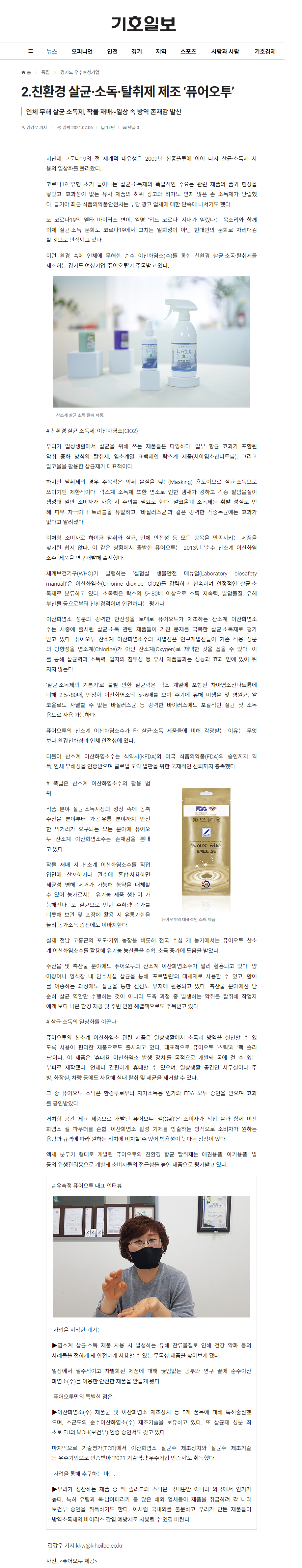 2.친환경 살균·소독·탈취제 제조 ‘퓨어오투’ - 기호일보