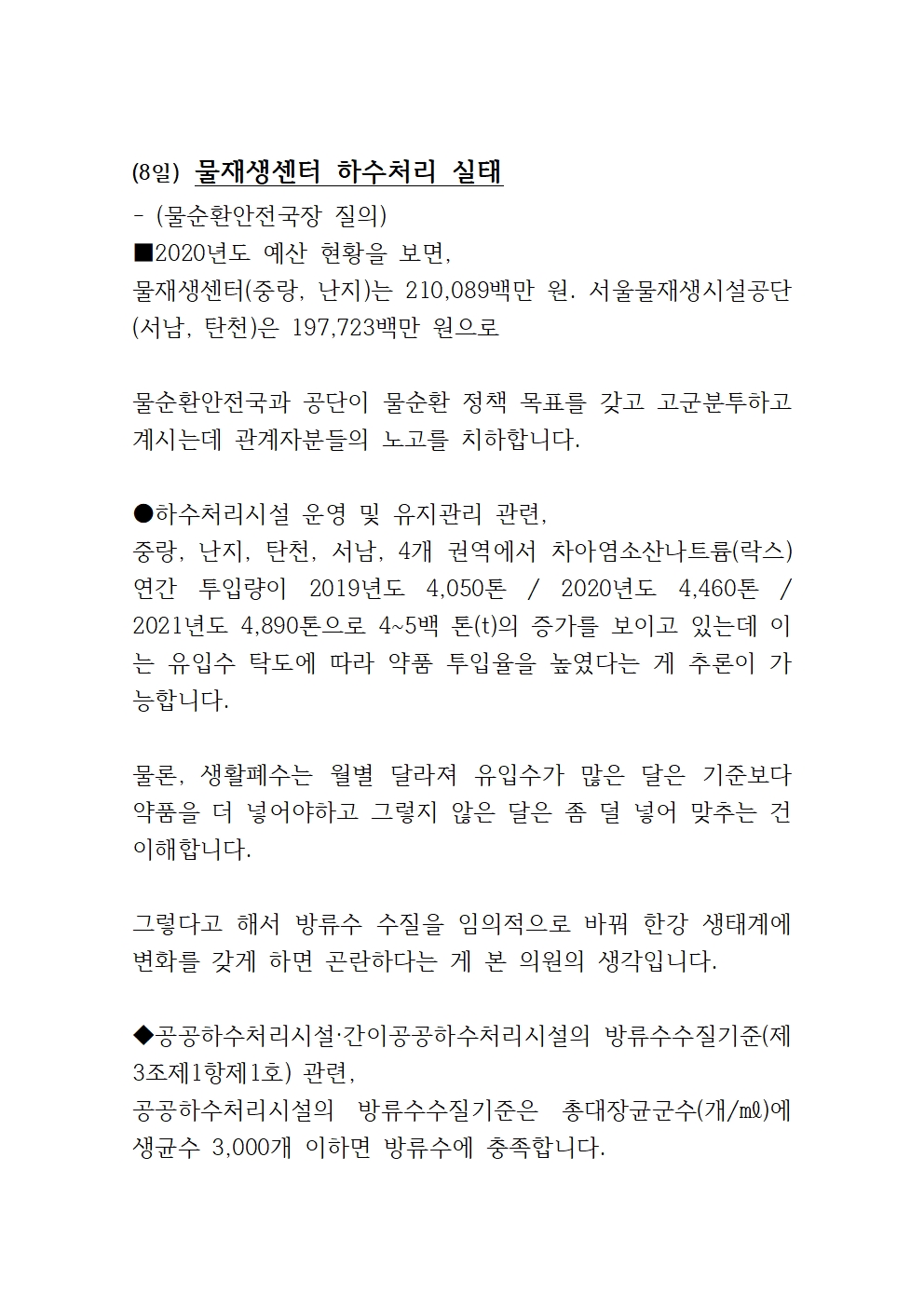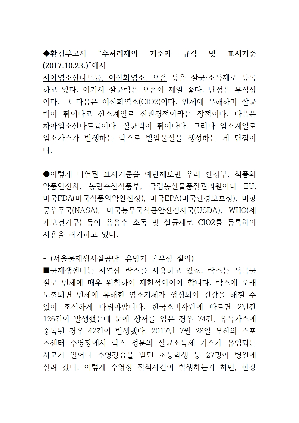 서울시 행정감사 물재생센터 방류수 실태 및 이해(유독물 락스와 이산화염소 비교)