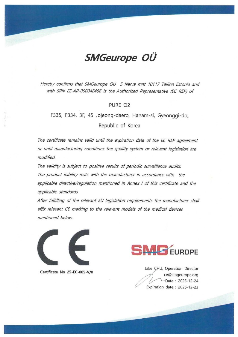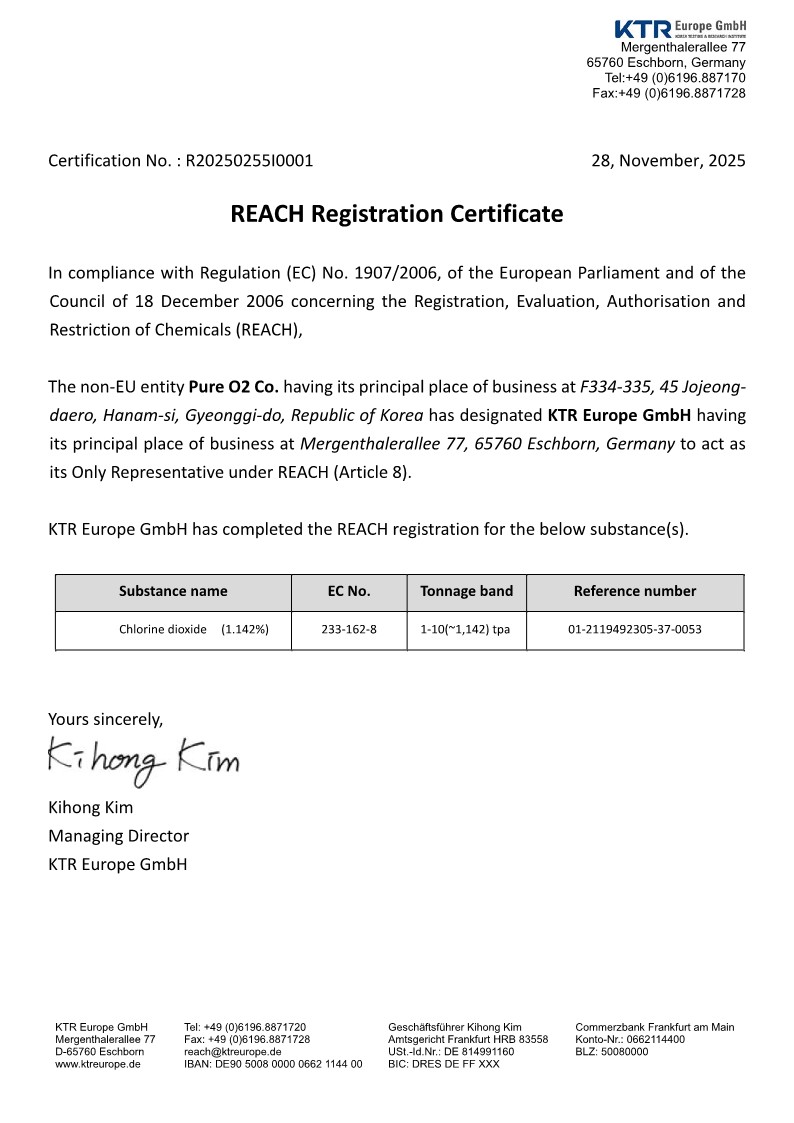 퓨어오투 이산화염소 CE인증, 유럽 ECHA REACH 등록.
